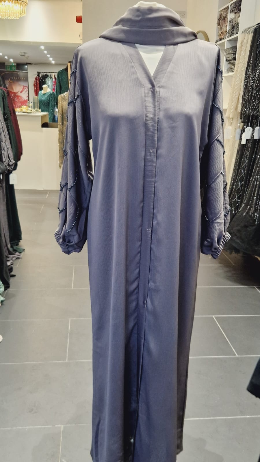 Elegant abaya with delicate bead embellishments on the sleeves and back. Features soft, gathered cuffs for a refined touch. Includes a matching hijab for a complete and graceful look. Available in black and mauve.